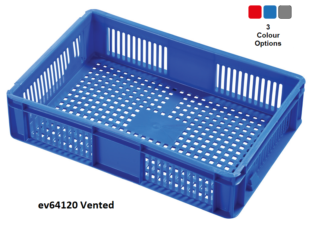 es64118 Blue – Vented Euro stacking container is available from stock in a variety of colours and type including grey, red and blue.